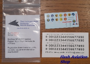 Northop NF-5A/B Freedom Fighter KLu / Royal Netherlands Air Force. Registraties (twee toestellen), 2 kleine Klu-roundels, squadron emblemen en staartbanden