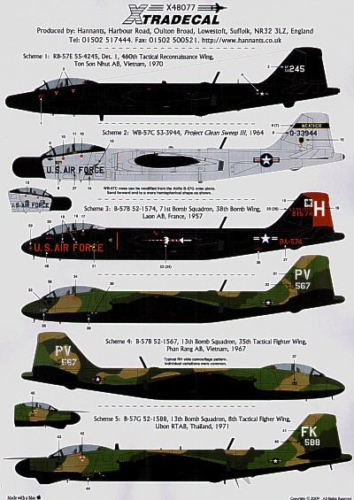 B-57 Canberra Pt 2 (5) B-57B 52-1567/PV 13th BS 35th TFW Phan Rang Vietnam 1967 SEA Camo; 52-1574/H 71st BS, 38th BW Laon AB France 1957 overall black; WB-57C 53-3944 Project Clean Sweep III 1964