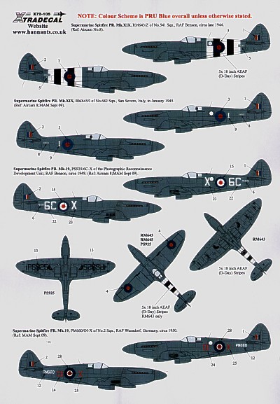Supermarine Spitfire PR 19 (12) RM643/Z 541 Sqn 1944 with D-Day stripes; RM645/I 682 Sqn Italy 1945; PS925 6C-X PR Development Unit 1948; PM660 OI-X 2 Sqn PS934 WY-R 541 Sqn 1950; PS887 ES-B 541