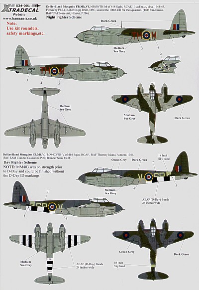 DH Mosquito FB.VI (4) NS850 TH-M 418 (City of Edmonton) Sqn 'Black Rufe' Night Fighter scheme; MM403 SB-V 464 Sqn RAAF with partial D-Day stripes Day Fighter scheme; HR118