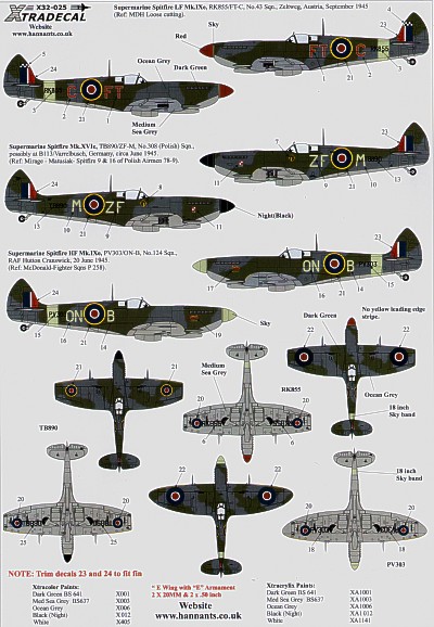 Spitfire Mk.IXe/Mk.XVIe (3) RK855 FT-C 43 Sqn Zeltweg Austria Sept 1945; TB890 ZF-M 308(Polish) Sqn Germany 1945, Both with clipped wing tips; PV303 ON-B 124 Sqn RAF Hutton Cranwick 20 June 1945