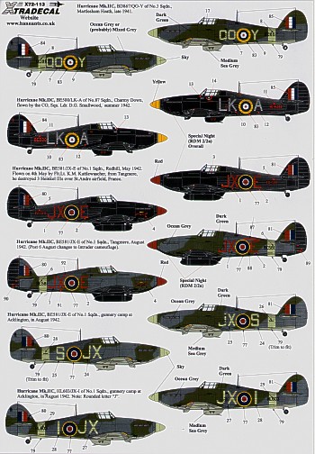 Hawker Hurricane Mk.IIc (18) BE500 LK-A 87 Sqn 1942; BE581 JX-E 1 Sqn Flt.Lt K. M. Kuttlewascher ; BD936 ZY-S 247 Sqn Exeter 1942. Overall black; BE581 JX-E 1 Sqn. HL864 LK-? 87 Sqn 1942; HL865 L