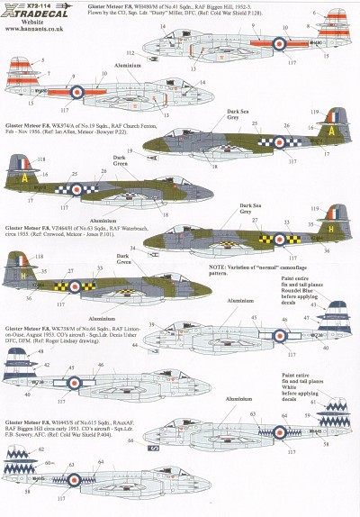 Gloster Meteor F.Mk.8 (12) WH480/M 41 Sqn RAF Biggin Hill 1952; WK738/M 66 Sqn RAF Linton-on-Ouse 1953; WH445/S 615 Sqn CO S/L Sowery RAuxAF RAF Biggin Hill 1953; WK786/W 72 Sqn CO S/L Clive Maso