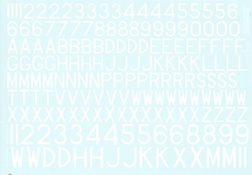 RAF Post War Serial Letters and Numbers, White. 16', 18', 20', 24', 30" and 48". 3 sheet set. For the same content in black see X72065