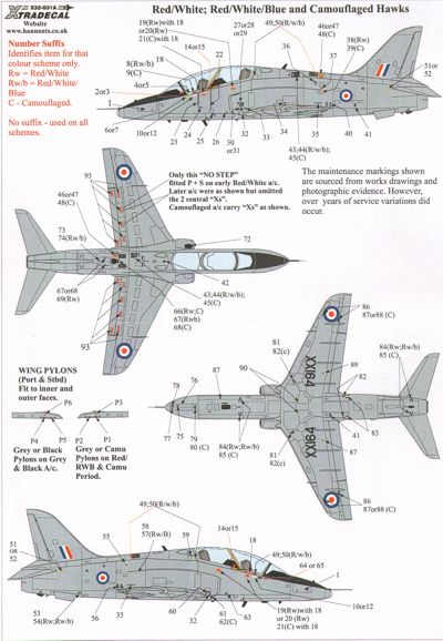 BAe Hawk T.1 Comprehensive Maintenance Marks for early Red/White/Blue and Camouflaged Dark Green/Dark Sea Grey. Sheet includes enough marking for one aircraft in each scheme.
