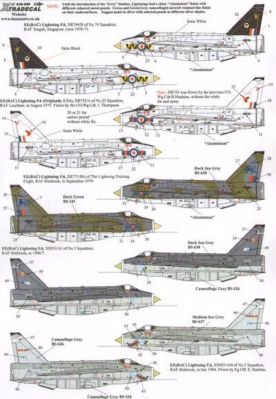 EE Lightning F.3A and F.6 (5) X769/B 74 Sqn RAF Tengah 1971 overall aluminium with black fin; XR753/A 23 Sqn RAF Leuchars Wg.Cdr. I.Thompson overall aluminium with white fin or B. Hopkins without