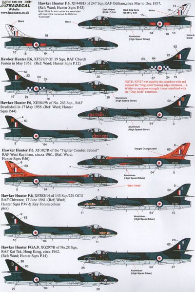 Hawker Hunter F.6 and FGA.9 (9) F.6 XF440/D 247 Sqn Odiham 1957; XF527/P 19 Sqn Church Fenton 1958; XE584/W 263 Sqn Stradishall 1958; XF382/R Fighter Combat School West Raynham 1961; XF383/14 145