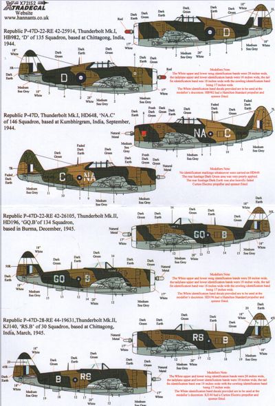 P-47D Thunderbolt in RAF service (12) Razorbacks HB982/D 135 Sqn Chittagong 1944; HD648 NA-C 146 Sqn China 1944; Bubble tops HD196 GQ-B blue codes or KL139 GQ-B white codes Jungle Queen both 134