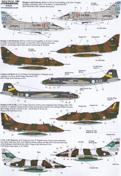 Falklands War 1982 Argentina (11); A-4B Skyhawk (A-4P) C-212 Grupo 5 (sank HMS Coventry); (A-4Q) 3-A-305 3A Escuadrilla Lt.Gull Grey/White; 3-A-304 3A Escuadrilla Green/Brown camo; A-4C, Canberra