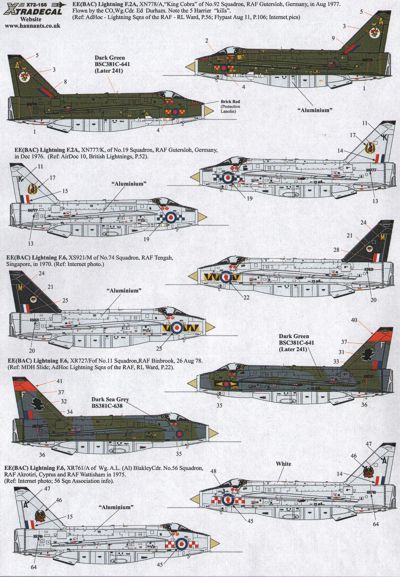 English Electric Lightning (7) Lightning F.2A XN778/A 'KIng Cobra' 92 Sqn CO W/Cdr Ed Durham RAF Gutersloh 1977; XN777/K 19 Sqn RAF Gutersloh 1976; Lightning F.6 XS921/M 74 Sqn RAF Tengah, Singap