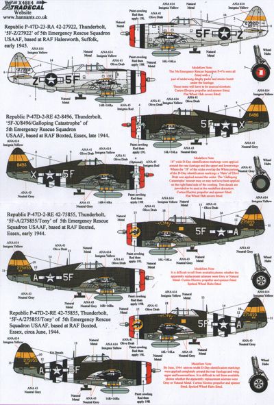 Republic P-47D Thunderbolt. They Also Serve. 5th Emergency Rescue Squadron (5). 42-27922 5F-Z RAF Halesworth 1945; 42-8496 5F-X 'Galloping Catastrophe'; 42-75855 'Tony' 3 versions, earlyJune or l