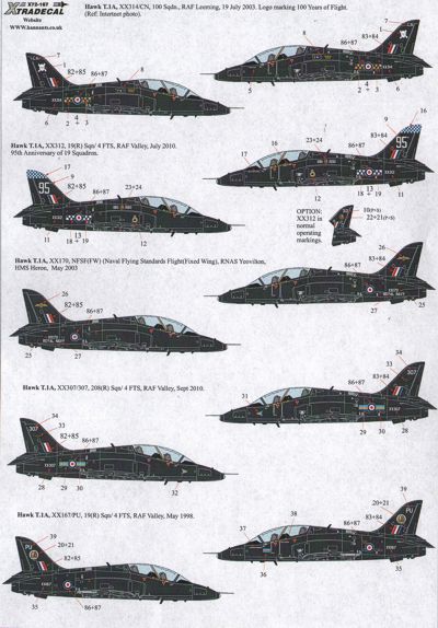 BAe Hawks in Black (10) Hawk T.1A and Hawk T.2. XX194/CO 100 Sqn RAF Leeming 2000; XX312 19(R) Sqn 95th Anniversary with blue/white checks on fin top, RAF Valley 2010; XX170 Naval Flying Standard