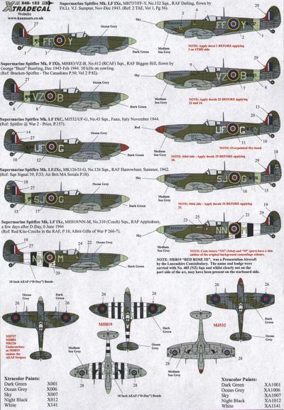 Supermarine Spitfire F.Mk.IXc (5) MH737 FF-Y 132 Sqn Fl.Lt V.Sumpter RAF Detling; MH883 WZ-B 412(RCAF) Sqn Geirge 'Buzz' Buerling Biggen Hill 1943-4; MJ532 UF-G 43 Sqn red spinner Fano, Italy; MK