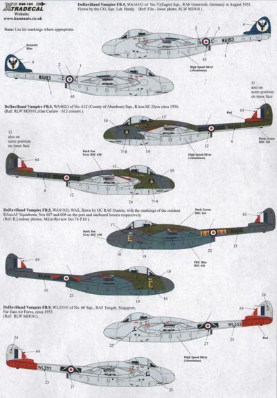 De Havilland DH.100 Vampire FB.5 and FB.9 (8) FB.5 WA163/G 71(Eagle) Sqnd RAF Gutersloh 1953; WA402/J 612 (County of Aberdeen) Sqn R.Aux.AF Dyce 1956; WA491/E OC RAF Ouston with 607 Sqn markings