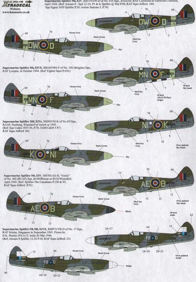 Spitfire Mk.XIV (14) High Back. RB159 DW-D 610 Sqn RAuxAF RAF Culmhead; RB169 MN-F 350(Belgian) Sqn RAF Lympe; NH703 AE-B 'Emily' 402(RCAF)Sqn Germany 1945; RM972 YB-D 17 Sqn RAF Seletar 1945; RN