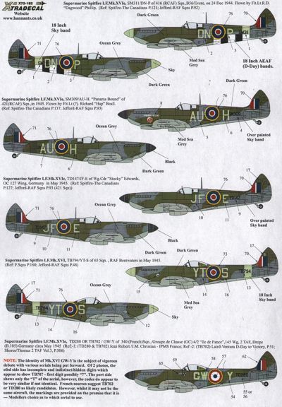 Spitfire LF.Mk.XVIe (11) High Back SM311 DN-P 416(RCAF) Sqn B56/Evere 12/1944 Partial D-Day stripes; SM306 AU-H 421(RCAF) Sqn 'Panama Bound' 1945; TD147 JF-E Wg.Cdr Stocky Edwards OC 127 Wing 194