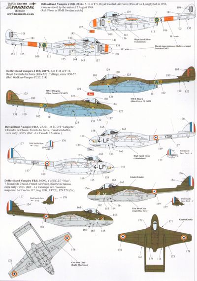 DH 100 Vampire Overseas Users (8) RCAF 17038 VC-ACO 402 (City of Winnipeg) Sqn early 1950s; Royal Norwegian AF P42459 PH-X 336 Sqn Silver; V0209 ZK-L etc