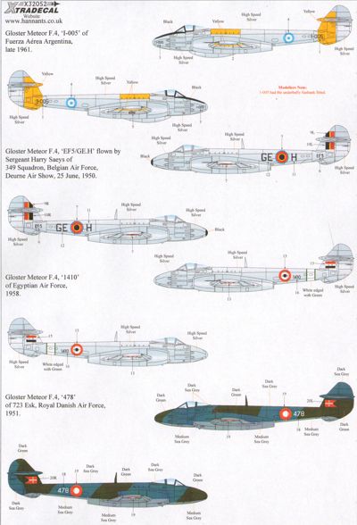 Gloster Meteor F.4 with Overseas Operators (4) Fuerza Aerea Argentina I-005 with yellow trim 1961; Belgian AF EF5 GE-H 49 Sqn flown by Sgt Harry Saeys at Deurne Air Show 25 June 1950; No 141 Egyp