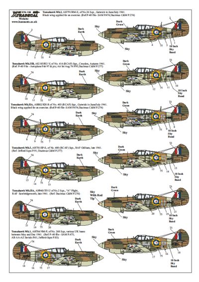 Curtiss P-40B Tomahawk (13) AH179 RM-E 26 Sqn Gatwick 1941; AK185 RU-V 414(RCAF) Sqn Croydon 1941; AH882 KH-A 403(RCAF) Sqn Gatwick 1941; AH784 NM-P 268 Sqn 1941; AH781 SP-S 404(RCAF) Sqn Odiham