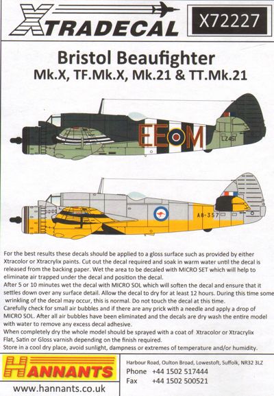 Bristol Beaufighter Mk.X, TF Mk.X, Mk.21, TT Mk.21 (10) Mk.X KW393/W 27 Sqn Burma 1945; LZ293 RAF Coastal Command 1944; TF Mk.X NE686 EO-T 404 Sqn RCAF Flt/Off Flynn/ P/O Michael RAF Coastal Com
