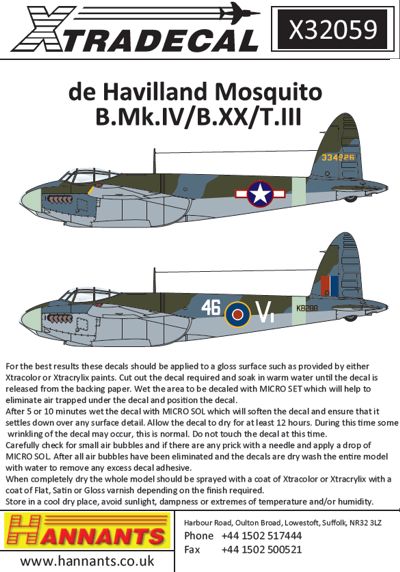 De Havilland DH Mosquito (5), T.Mk.III TV970 FK-V 219 Sqn RAF Wittering 1946; B.k.IV DZ421 XD-G 139 Sqn Sg/Co Peter Shand/P/Off C.D.Handley RAF Marham 1943; B.Mk.XX KB253 RJ RCAF; B.Mk.XX KB288 V