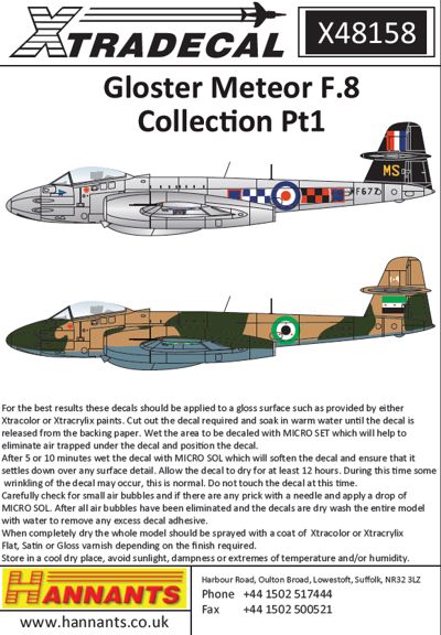 Gloster Meteor F.8 Collection Pt 1 (8) RAF. VZ482/C 610 Sqn Camouflaged RAF Hooten Park 1950s; Royal Australian AF A77-316 77 Sqn and A77-15 77 ; Syrian AF No 1-9 1956 Desert Camo. Belgian AF EG-