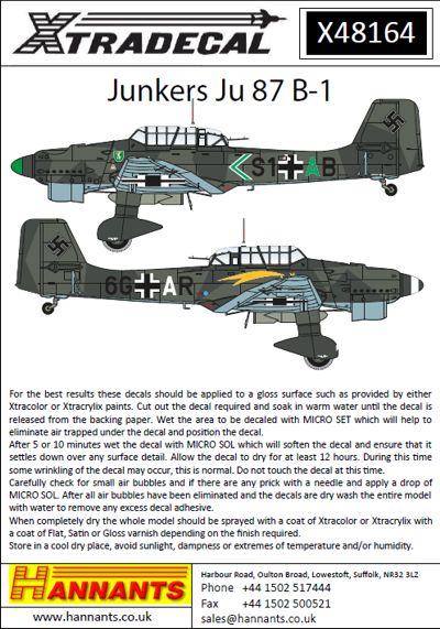 Junkers Ju 87B-1 (8) T6+BC Stab/St.G2 Bonn-Hangelar 1940; T6+GM 7/St.G2; T6+EP 6/St.G2; T6+BS 8/St.G2 1940; 6G+AR 7/St.G51 France 1940; S1+AB 1/St.G76 Hptm Walter Sigel Poland 1949; S2+EP 6/St.G7