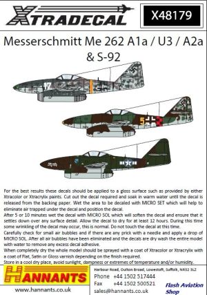Messerschmitt Me 262A1a/U3/A2A (8) A1a W.Nr110956 White 17 Ekdo 2; W.Nr111617 White 9 II.EJG 2 Ofw. Zander; W.Nr170047 White 1 Kommando Novotny, Franz Schal 1944; W.Nr500491 Yellow 7 IV/JG 7 Obfw