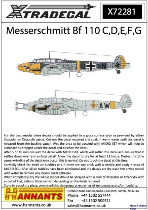 Bf-110C-4 3M+-B 1/ZG2Oblt Gruppenadjutant Gerhard Granz France 1940 RLM70/71/65; Bf-110C-4 A2+EK 5/NJG 3 Skagerrak 1941 RLM70/71/65; Bf-110D-2 3U+5R 7./ZG26 Staffelcapitan Oblt. GottfriedKotwatsc